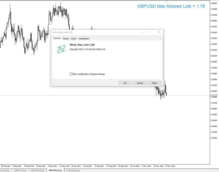 This indicator shows the maximum position size you can place at any given moment on the current pair according to the leverage and account equity.