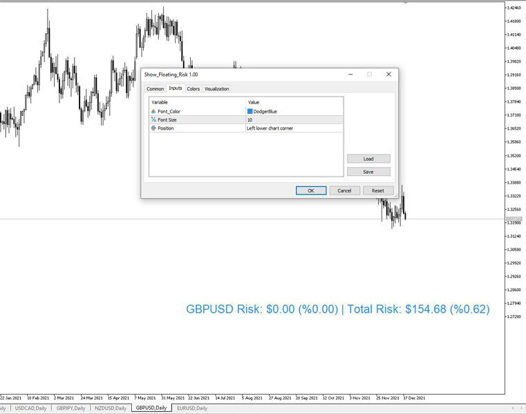 This indicator shows the risk exposure per pair and in total, by calculating the risk value of all the open positions that have stop loss orders, so you can clearly see the value being risked in $ and %.